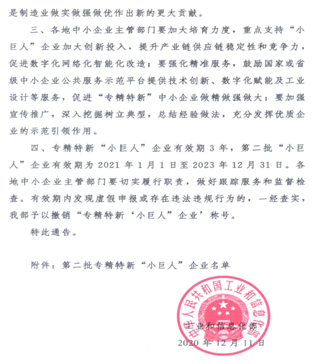 公司荣获2021年度中央财政支持的国家级重点专精特新“小巨人”企业。获国家财政支持500万元。